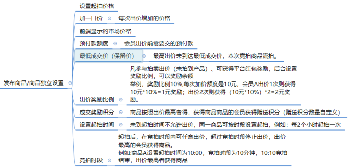 1、拍卖商品设置起拍价、每次加价额度、设置预付款额度,可以设置最低成交价(保留价),最高出价未到达最低成交价,本次竞拍商品流拍。