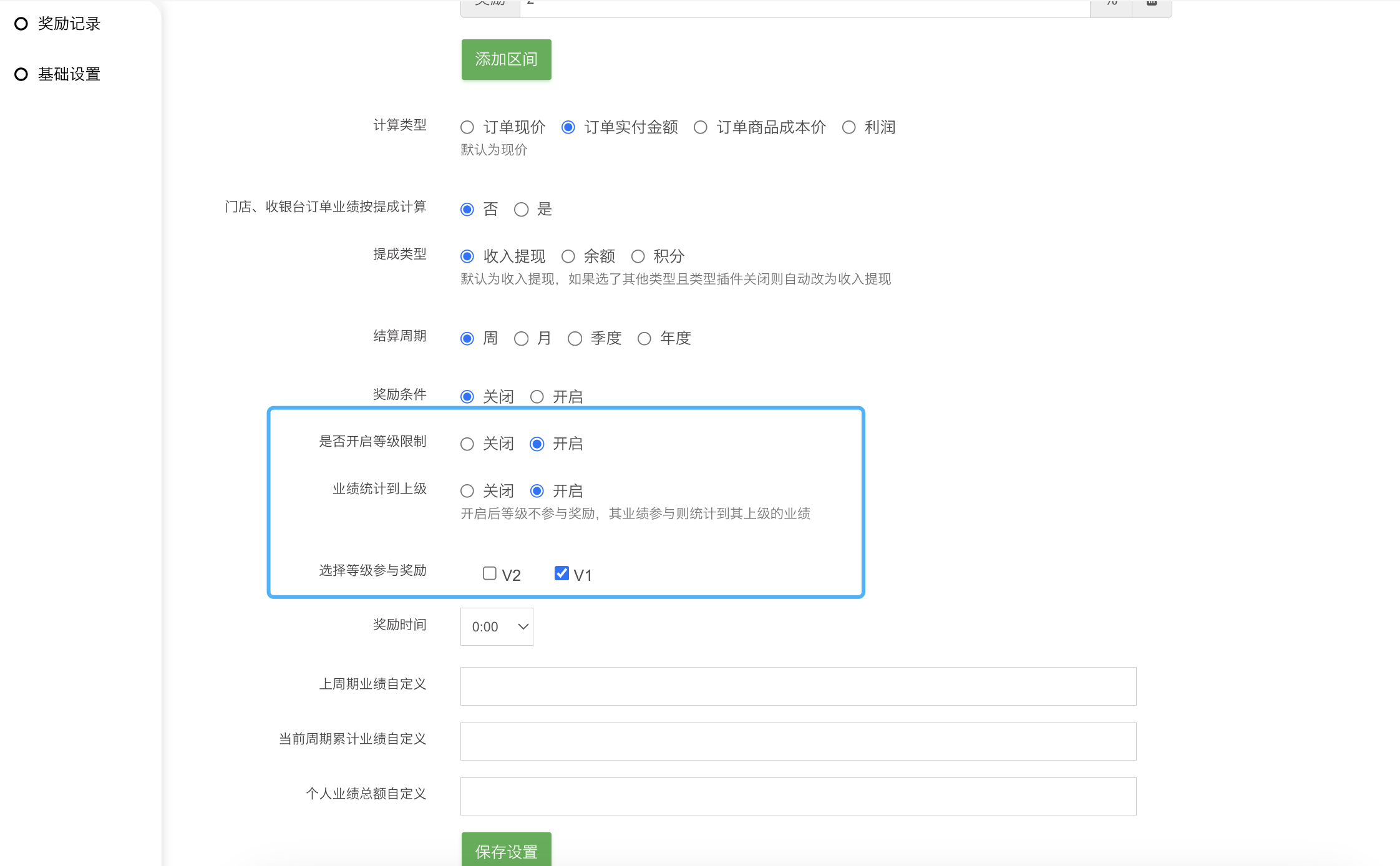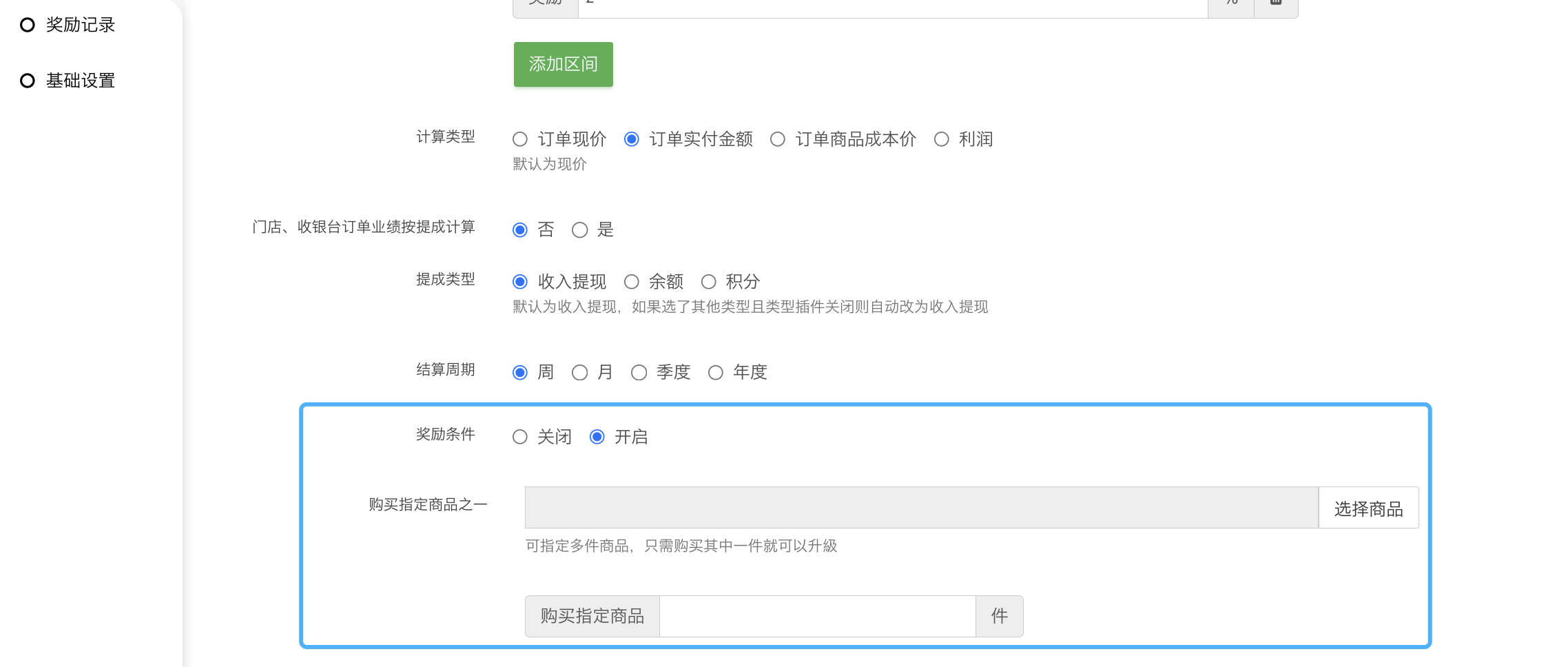 结算周期:选择周则周一奖励,选择月则1号奖励,选择季度则每季度的1号奖励,选择年度则每年的1号奖励。